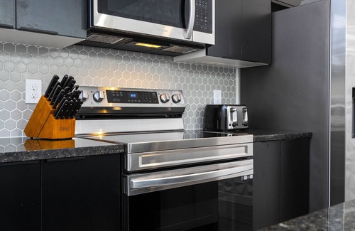 • Fully equipped kitchen with stainless steel appliances and essential cookware