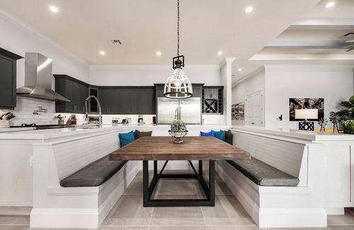 With an open planned floor plan, the living area is bright and spacious with a large wrap-around sofa before a large wall-mounted TV. The stunning kitchen with stainless steel appliances and granite countertops includes an over-sized double-sink kitchen island. The island counter wraps around a built-in seating area with cushioned benches around a kitchen table. Around the corner you'll find a fine dining table that seats 18 - you're entire party!