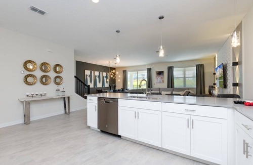 You will feel immediately relaxed as you enter our9 bedroom, 5 bathroom executive home which sleeps up to 16 in style. We have paid great attention to every detail when we furnished this home and we hope you will enjoy it as much as we do with our own family. With 5 king bedrooms, 1 queen bedroom, 1 full bunk with twin below and 1 room with 2 twins , there is plenty of room for everyone to spread out and relax after a day out or just to stay in and take it easy. Each room has a different feel so all guests should be equally happy with their room, and all have wall mounted flat screen LED Tv's. The dining room and living area offers plenty of space to congregate and enjoy meals together, and the bright and airy kitchen has all the appliances that you would expect in your own home. (There is also a full-size washer and dryer). You can also enjoy a game of pool in the game room, or watch a movie in the huge loft area, or leave the kids to play on the PlayStation. Or why not take a dip in the large pool or relax in the spa, even in the evening as the pool area is south facing? This home will bring all the excitement of Orlando to you, and have the entire group talking about your trip for months to come.