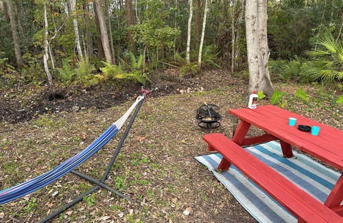 Mins. from major theme parks, airports & less than 10min from UCF. Come stay in our 2bedroom, 3beds, full kitchen & bathroom RV! Surrounded by different trees, plants, butterflies, birds & other wild life. Enjoy the lovely setting of this romantic spot in nature. 4person hot tub with awning under the stars & lit forest . Picnic table, games & fire pit. So much to do & explore. Glamping, Camping, Nature Vibes or Just A Quick Stay!