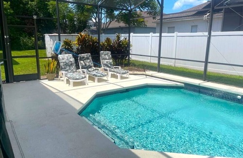 Comfortable living area with easy access to your private, screened-in pool, framed by lush landscaping and perfect for swimming, lounging, or evening barbecues.